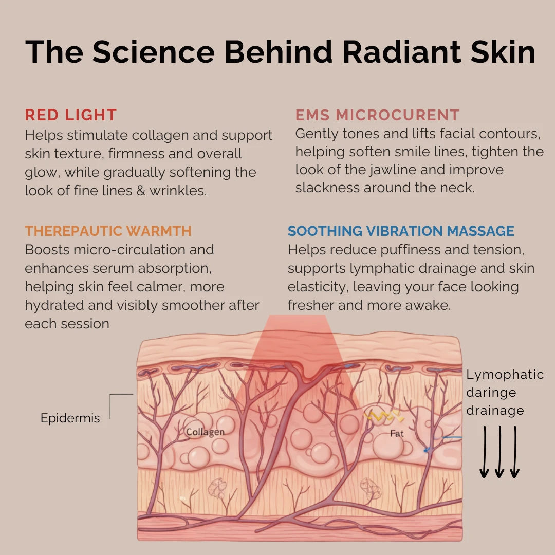 Many in-clinic treatments – including some lasers and radiofrequency – work by creating controlled injury in the skin so it has to repair itself. The SKINERISE 4-in-1 Wand takes a different path: it uses low-level red light (630 nm), EMS microcurrent, gentle warmth and vibration massage to support your skin’s own repair processes – with zero pain, zero damage and zero downtime.